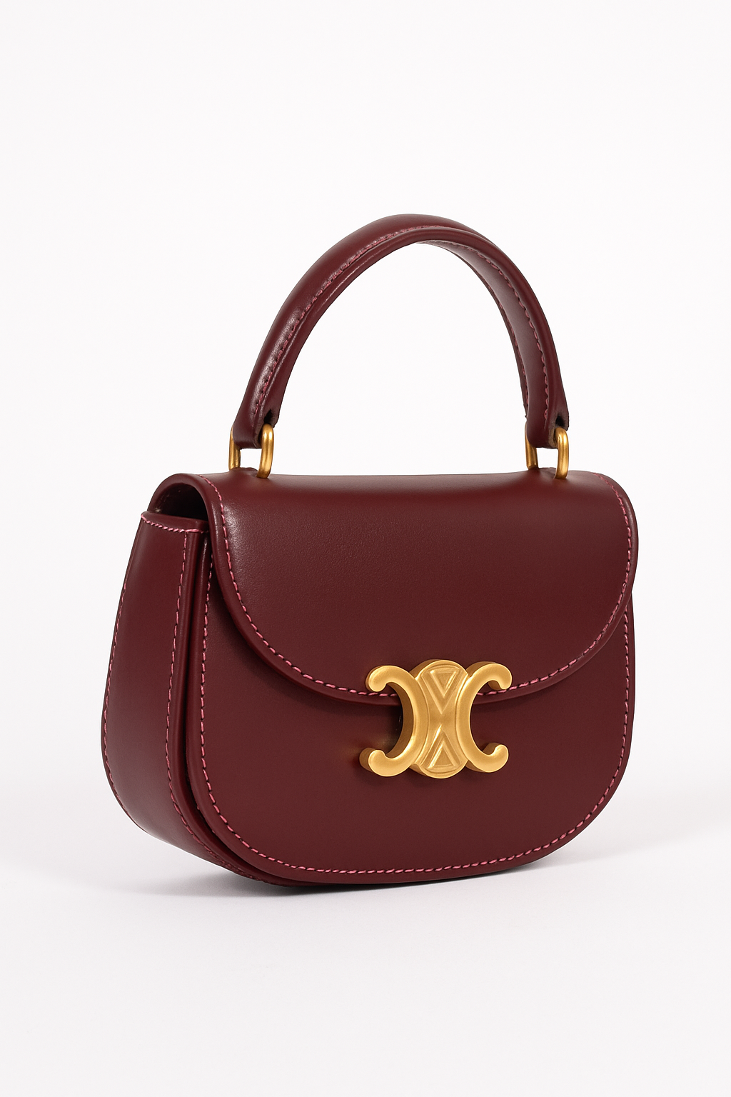 Изработена от висококачествена гладка кожа в дълбок бордо нюанс, тази чанта впечатлява с минималистичната си форма и характерното златисто лого Triomphe – символ на лукс и финес.