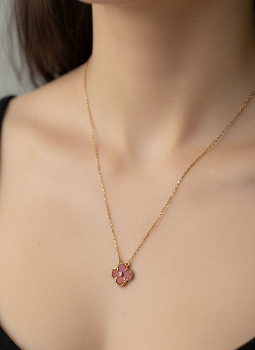 Нежно дамско колие VC с фина позлатена верижка и елегантна флорална висулка в розов цвят, акцентирана с деликатен кристал в центъра. Бижуто впечатлява с изчистен дизайн и женствено излъчване, което го прави подходящо както за ежедневна визия, така и за специални поводи. Стилен и изискан аксесоар, който добавя фин лукс към всяка визия.
