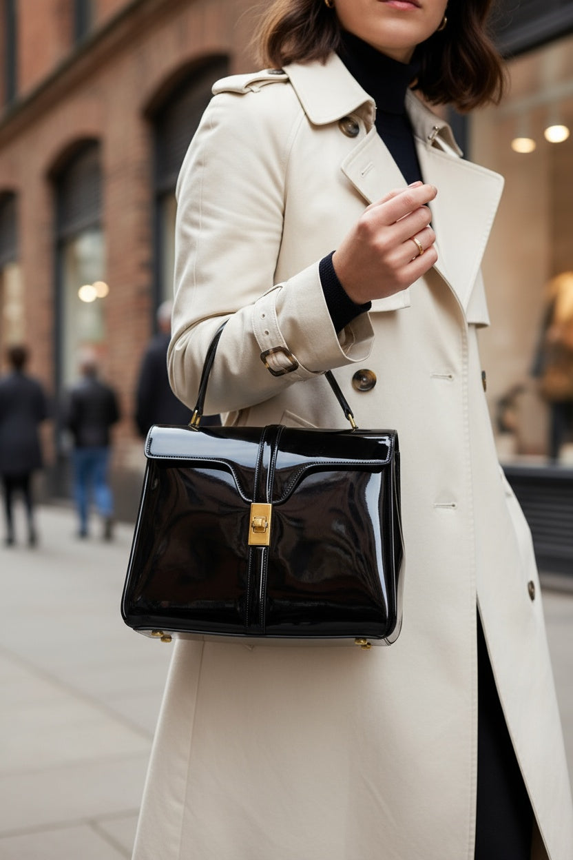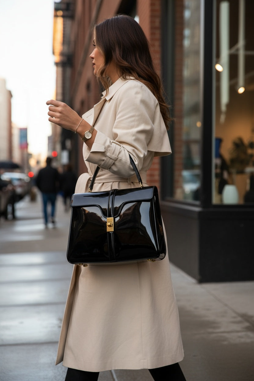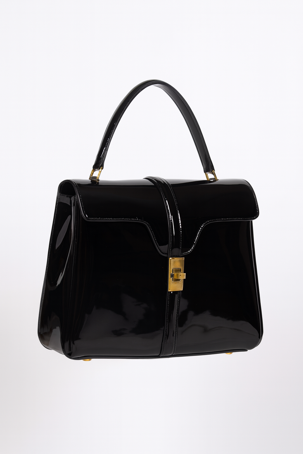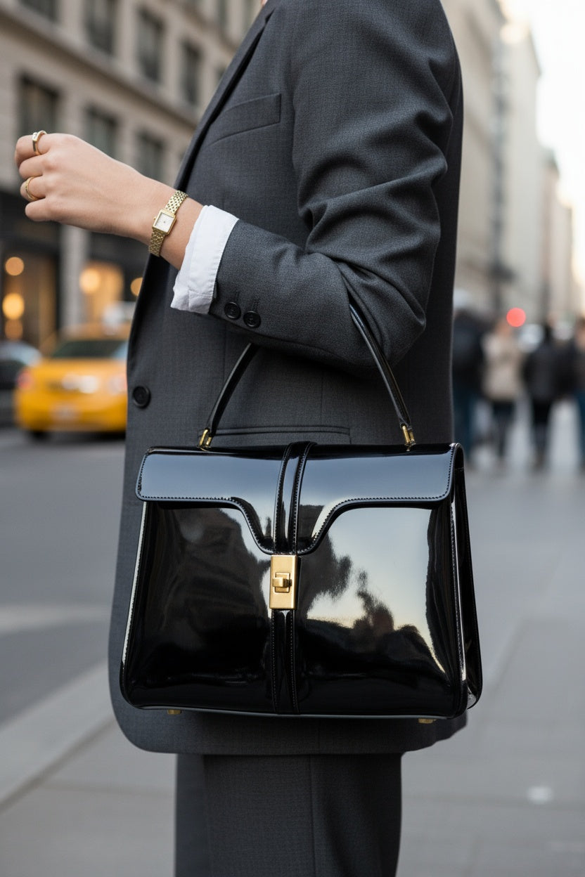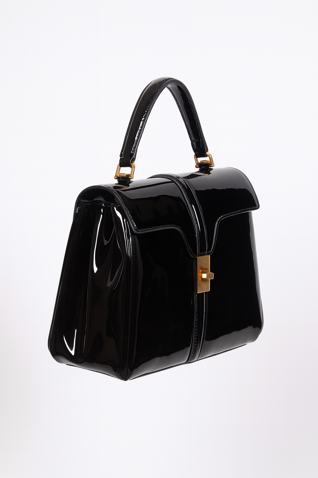 Представяме тази дамска чанта Céline изработена от висококачествен черен лакиран материал, която впечатлява с изискан блясък и елегантна форма. С гладка и чиста повърхност, тази чанта комбинира модерната визия с нотка лукс.