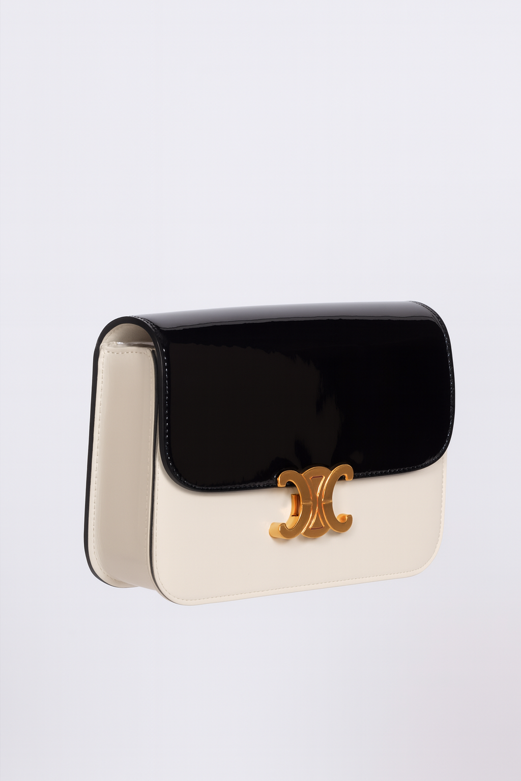 Емблематичната CEL Triomphe Shoulder Bag е символ на парижката елегантност и модерната класика. Тази дамска чанта впечатлява с изчистен дизайн, изработен от висококачествена кожа в контрастни цветове — черно и бяло, подчертаващи нейния минимализъм и луксозен характер.