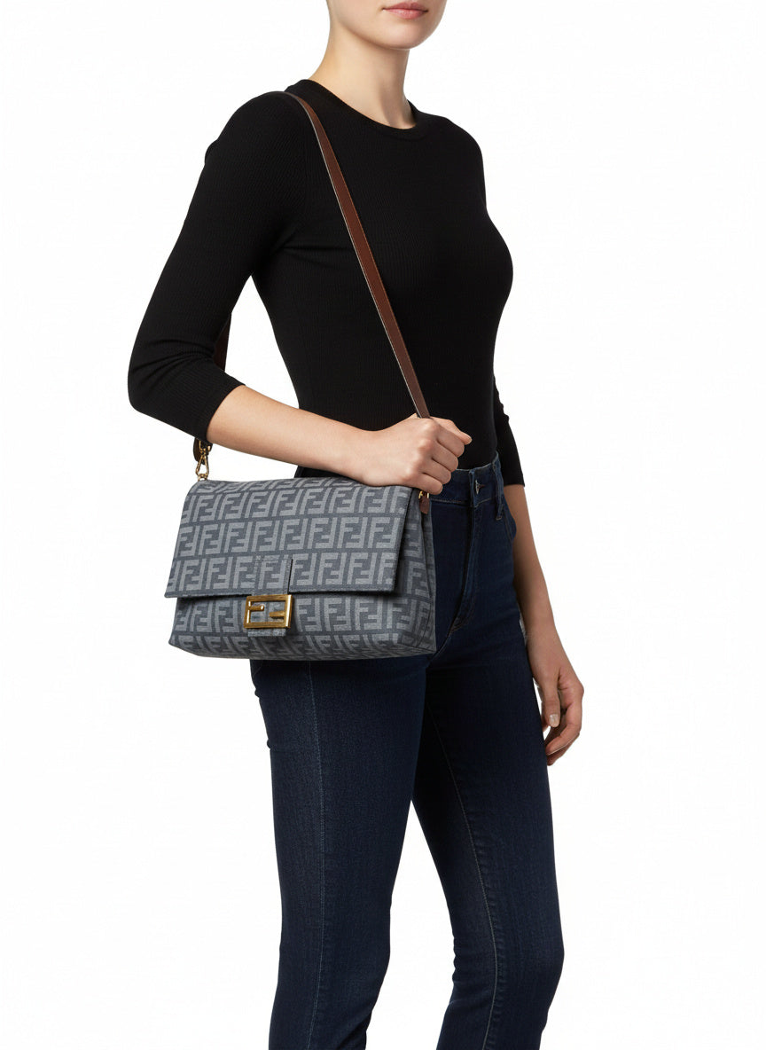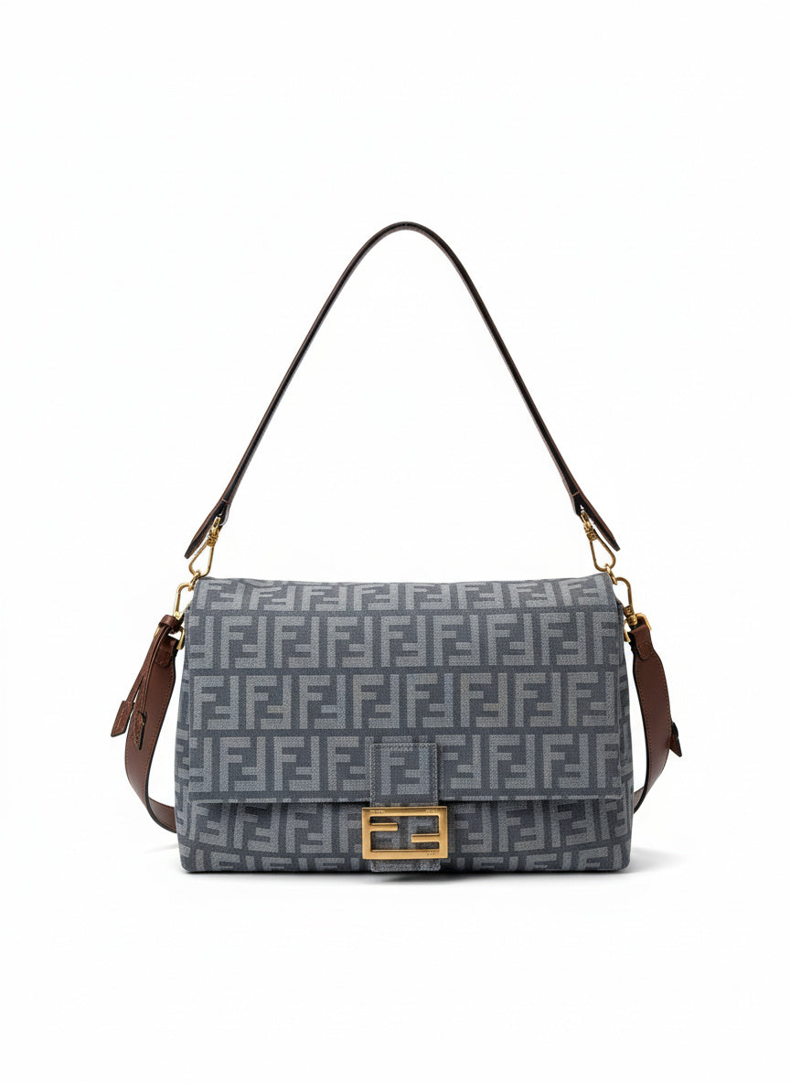 Изтънчена дамска чанта F FF Embroidered Bag, изработена от висококачествен текстил с емблематична бродерия на FF мотива. Характерната сиво-кафява гама с деликатни светли акценти подчертава разпознаваемия стил на F, а златистото метално закопчаване с лого придава завършен, луксозен акцент – символ на италианска елегантност и модна иконичност.