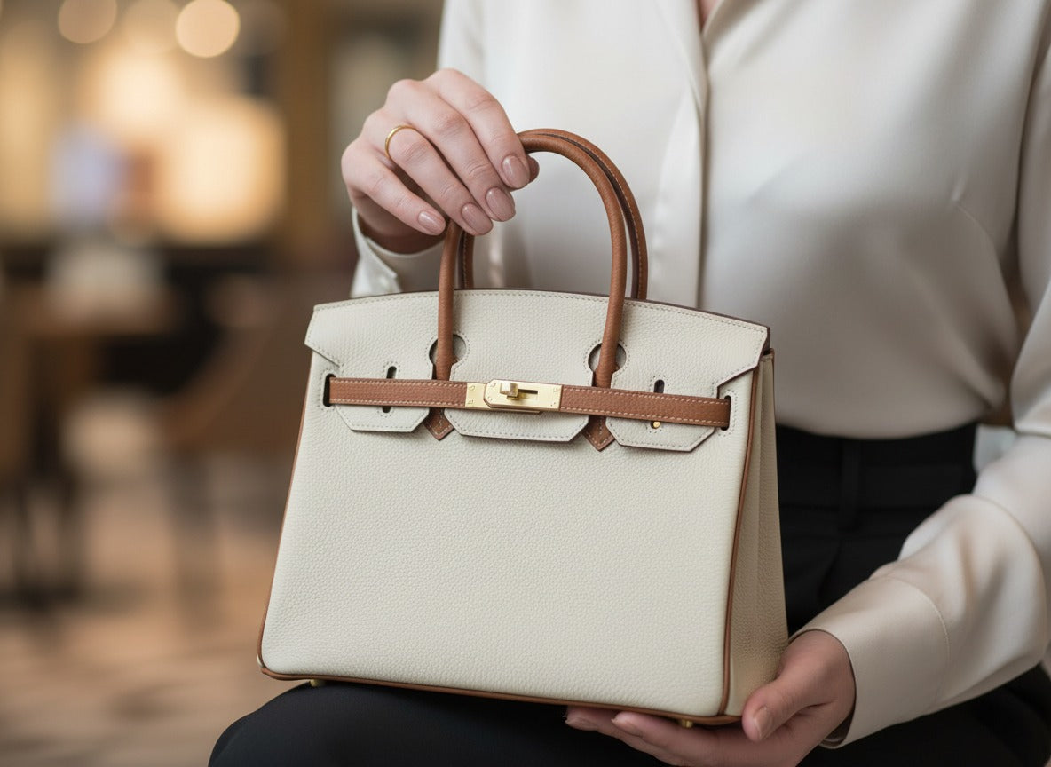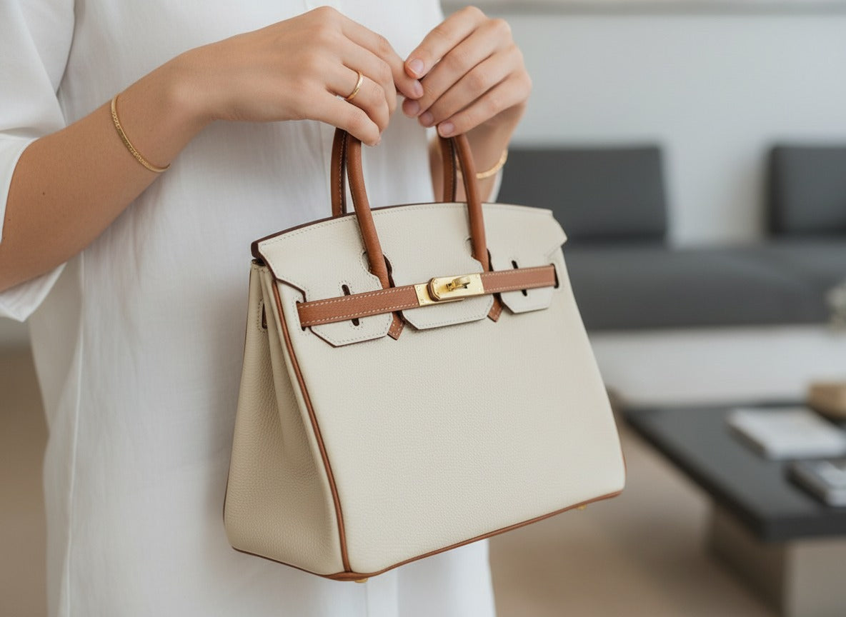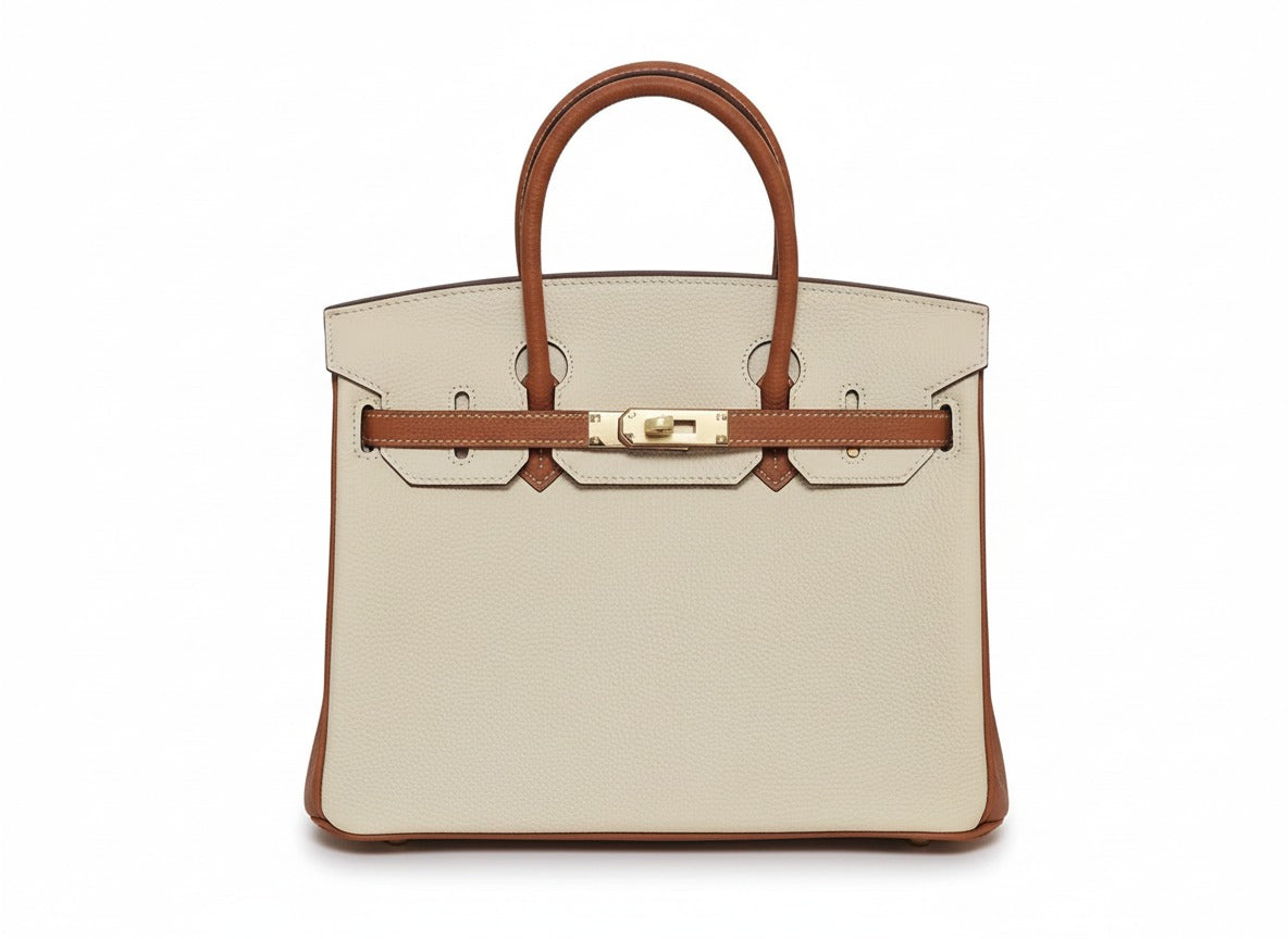• Позлатен метален хардуер — емблематичната закопчалка, халки и катинар на H, които допринасят за луксозния вид.