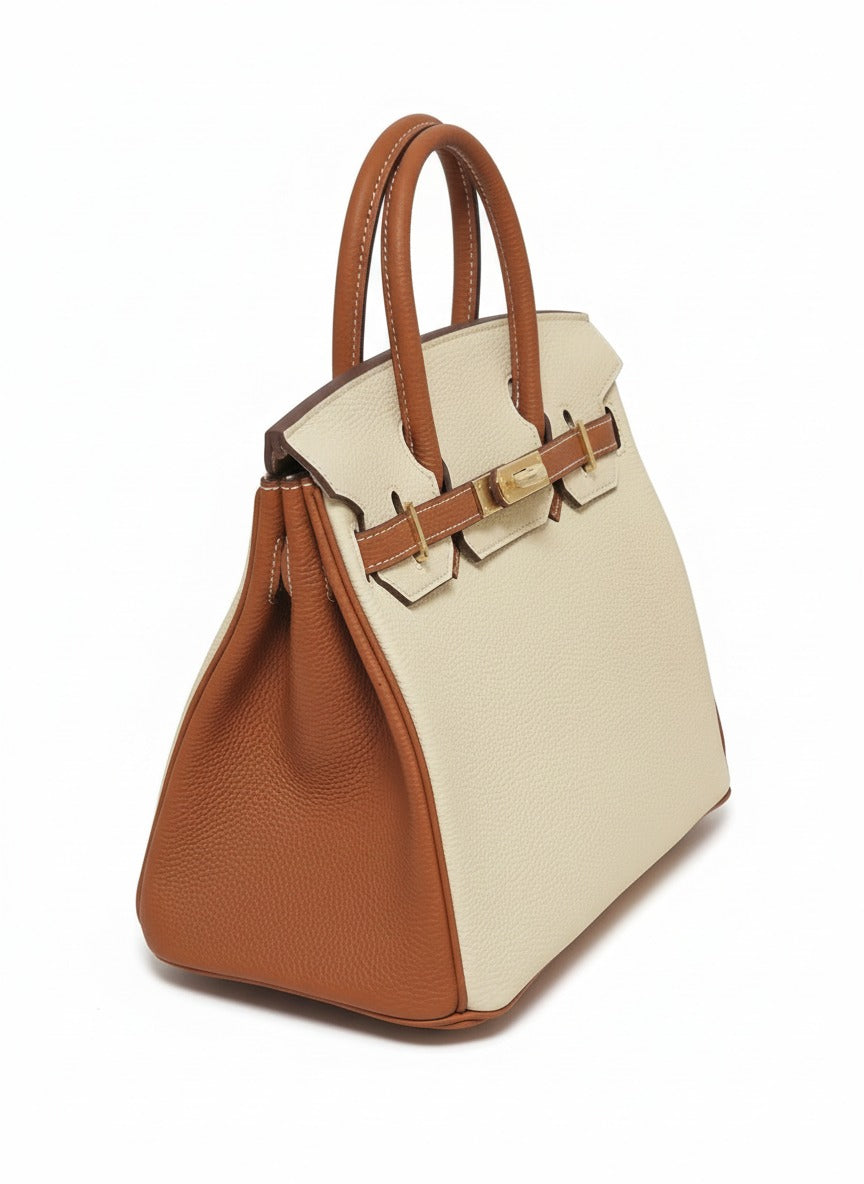H K Bag — Елегантна кожена чанта в екрю с контрастни кожени детайли и позлатен хардуер