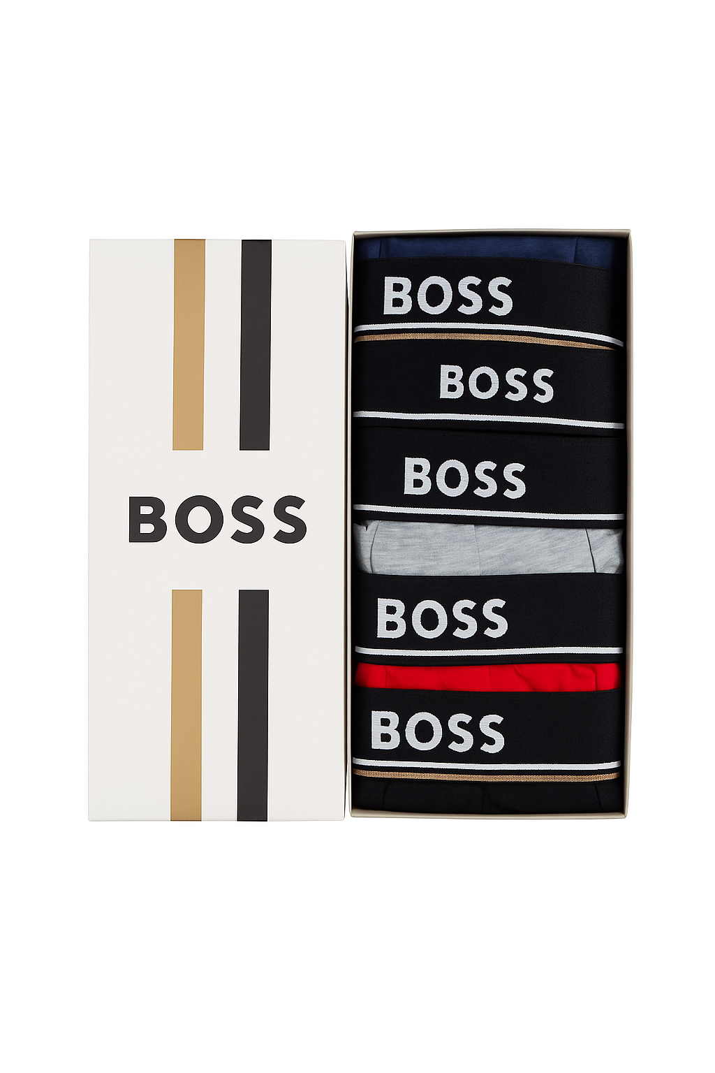 Комплект от 5 броя мъжки боксерки B в разнообразие от цветове: червен, черен, сив, син и тъмносин. Всеки чифт е с класически черен колан с логото на марката, съчетавайки комфорт и стил. Изработени от висококачествен памук, тези боксерки осигуряват удобство и трайност през целия ден. Комплектът е опакован в елегантна подаръчна кутия, което го прави идеален както за лично ползване, така и за подарък.