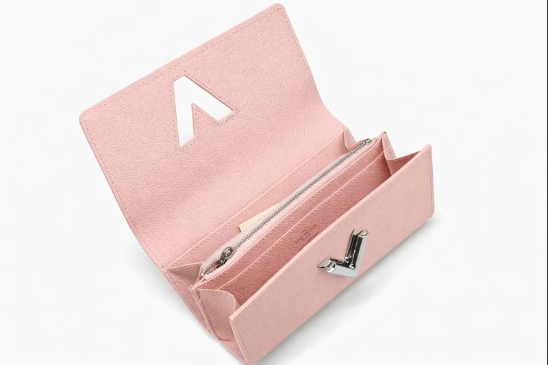 Елегантно дамско портмоне с изтънчен дизайн и характерен LV акцент. Моделът впечатлява с фината си текстура и стилна визия, която подчертава женствеността и усещането за лукс. Практично разпределено вътрешно пространство, подходящо за банкноти, карти и монети, с централен джоб с цип за сигурно съхранение. Металното лого отпред придава завършен и модерен акцент.
