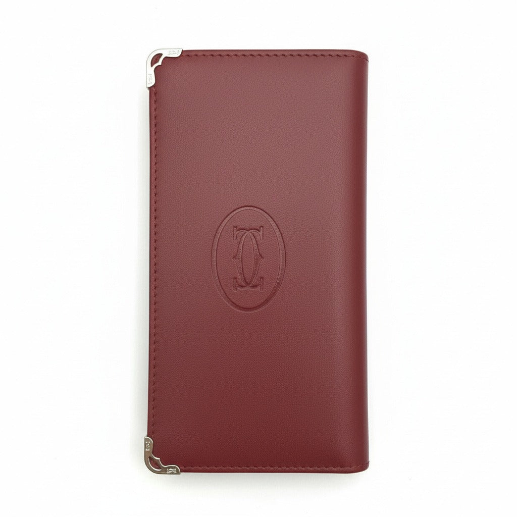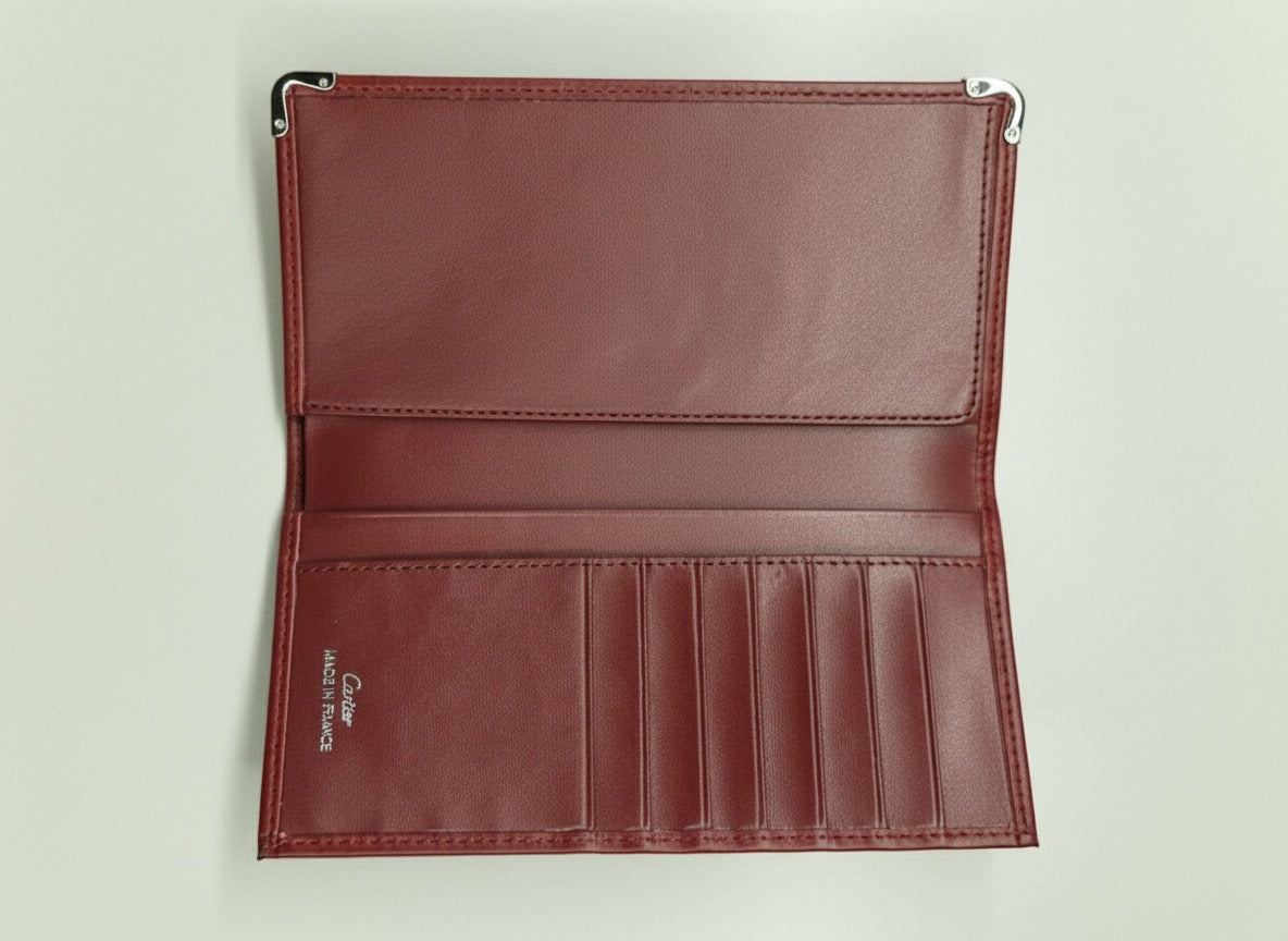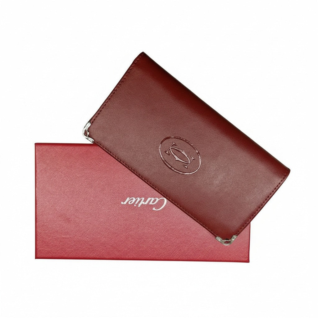 Елегантен унисекс портфейл C, изработен от първокласна естествена кожа с гладка и фина текстура, допълнен с емблематично релефно лого C. Наситеният бордо цвят придава дълбочина и характер, а дискретните метални акценти по ъглите добавят усещане за изискан, аристократичен лукс.