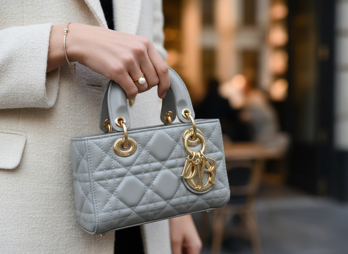 Lady D Mini Bag — Светлосива кожена чанта с позлатени детайли