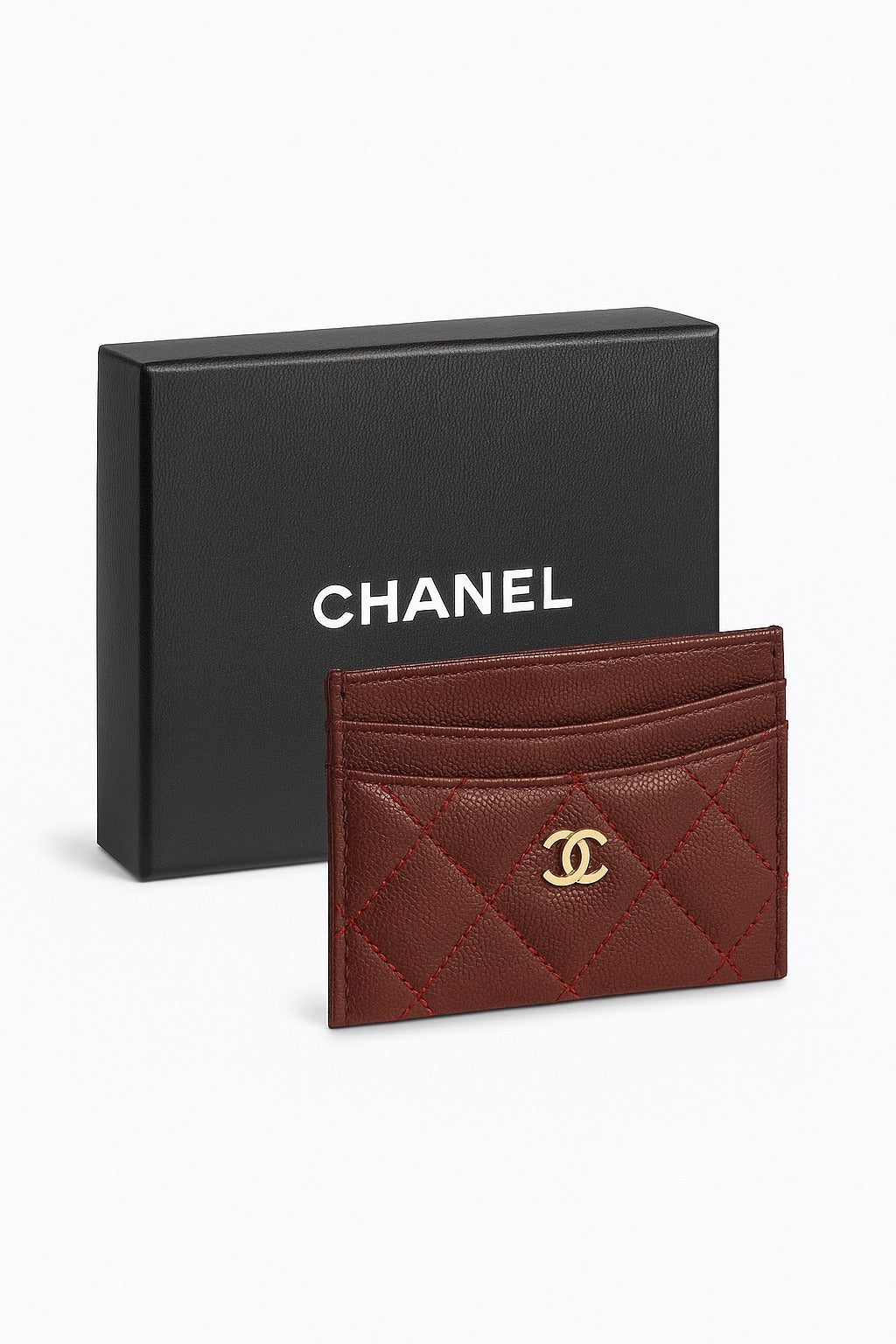Луксозен дамски кардхолдер CH, изработен от първокласна естествена кожа с фина капитонирана текстура. Наситеният кафяв бордо в съчетание със златното лого CH придава топъл, изискан и неподражаем облик – символ на класическа елегантност и стил.