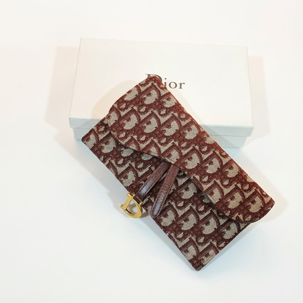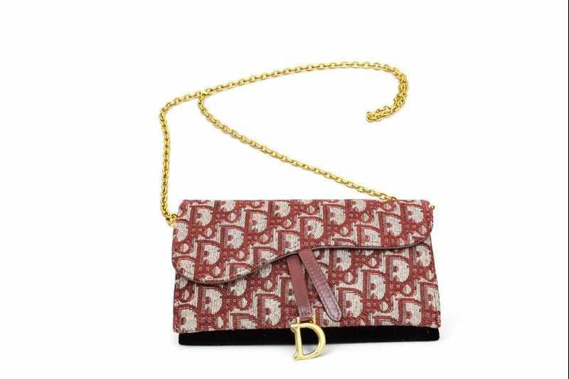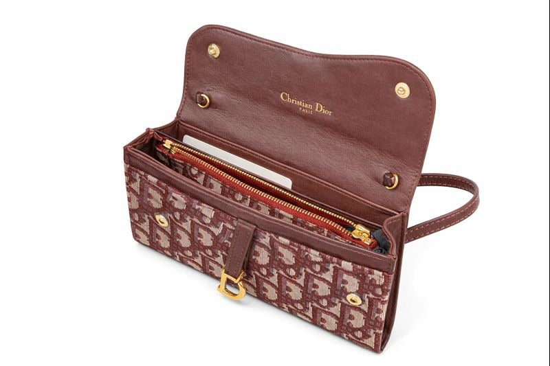 Елегантно дамско портмоне CD, съчетаващо изискан дизайн и практична функционалност. Моделът е изработен в стилен текстилен монограм в наситен бордо нюанс, допълнен от фини кожени детайли и златисти акценти, които придават луксозно излъчване.