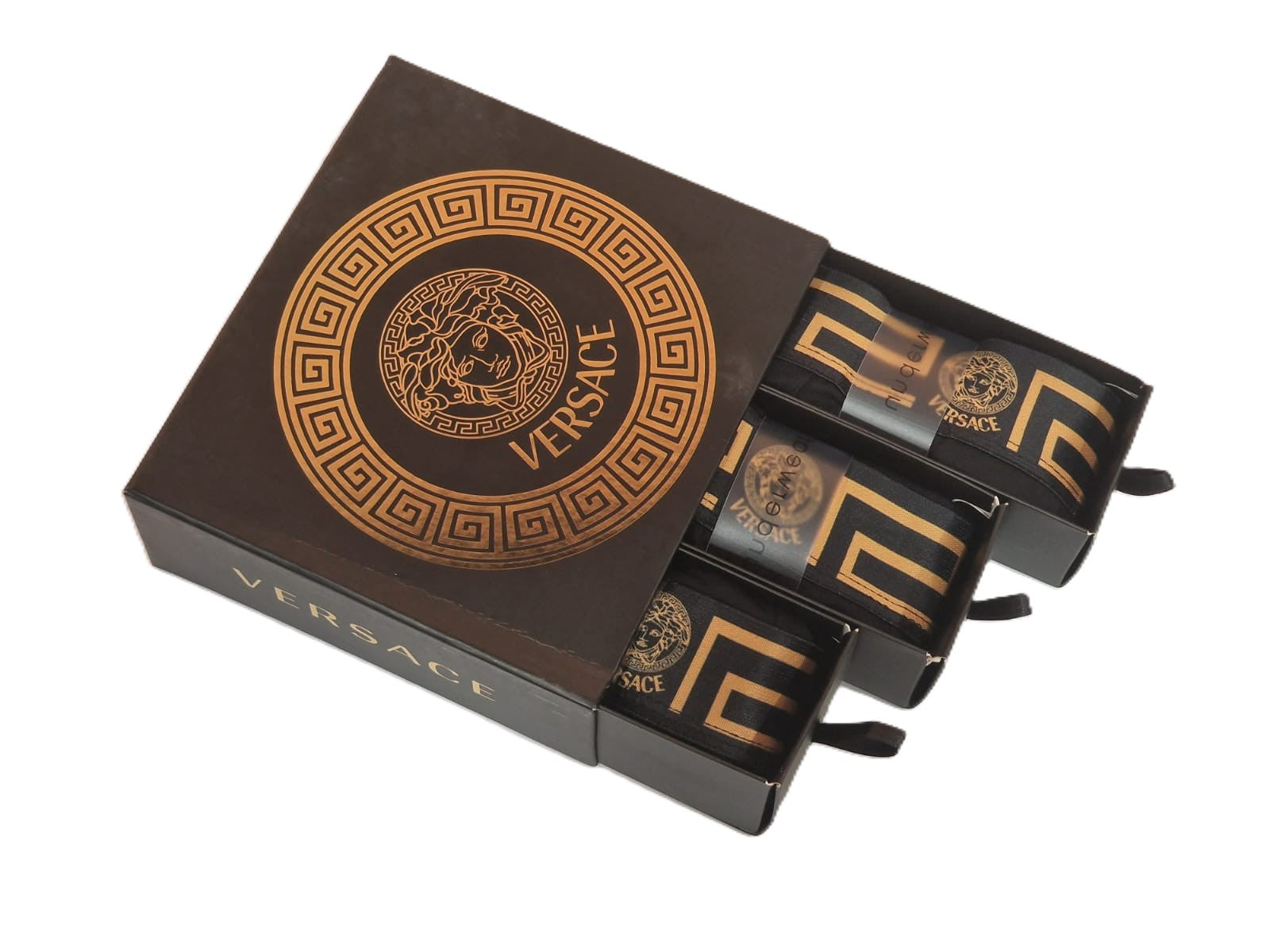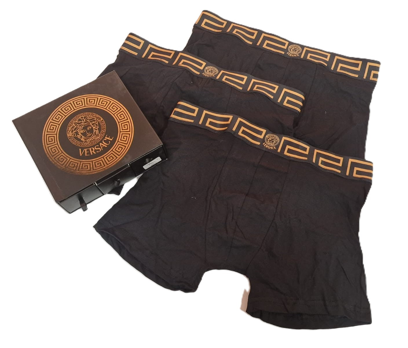 VER предлага комплект от 3 броя черни боксерки с елегантен колан в златисто, украсен с емблематичния гръцки ключ и логото на марката. Изработени от висококачествени материали, тези боксерки съчетават комфорт и лукс, осигурявайки изключителна издръжливост. Опаковани в луксозна подаръчна кутия, те са перфектният избор за стилен подарък или личен акцент в гардероба.