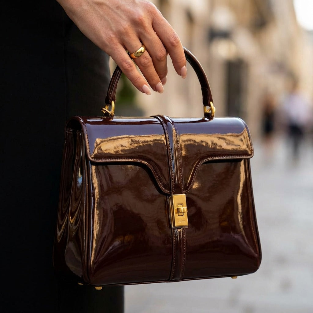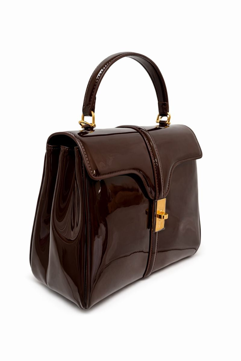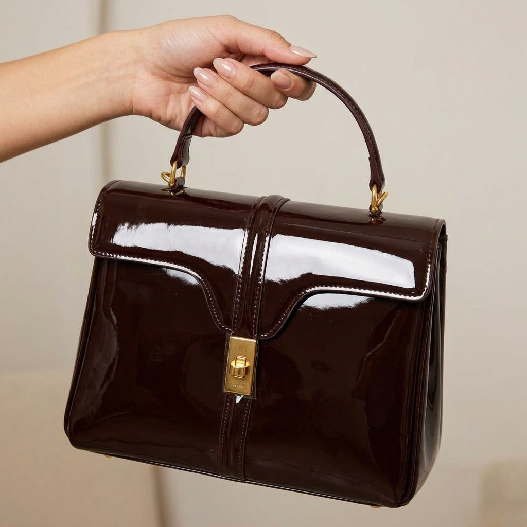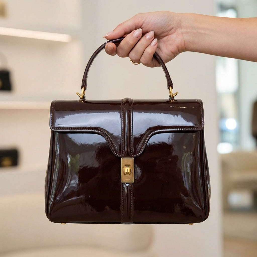 Елегантна дамска чанта CEL, излъчваща неподправен лукс и класическа женственост. Моделът е изработен от висококачествена лачена кожа с дълбок, наситен кафяв цвят и изящен гланцов завършек, който подчертава изтънчения ѝ характер.