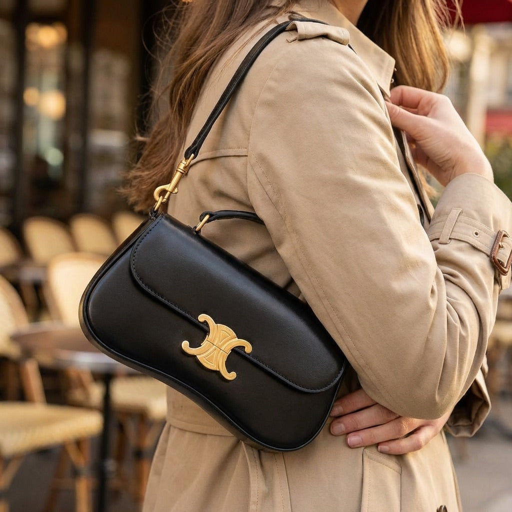 Акцентът е поставен върху емблематичната златиста метална закопчалка в центъра, която придава характер и разпознаваем стил на чантата. Късата горна дръжка позволява носене в ръка за класическа визия, докато фината кожена презрамка дава възможност за носене на рамо или през рамо – практично и елегантно решение за динамичното ежедневие.