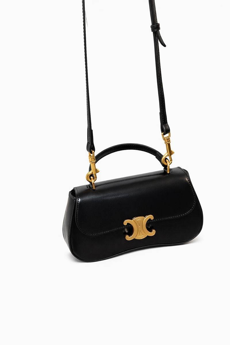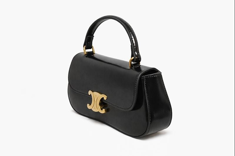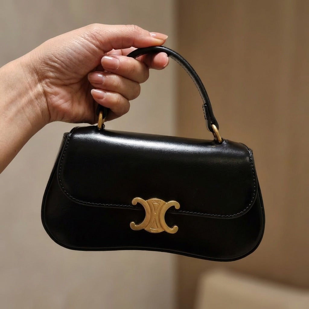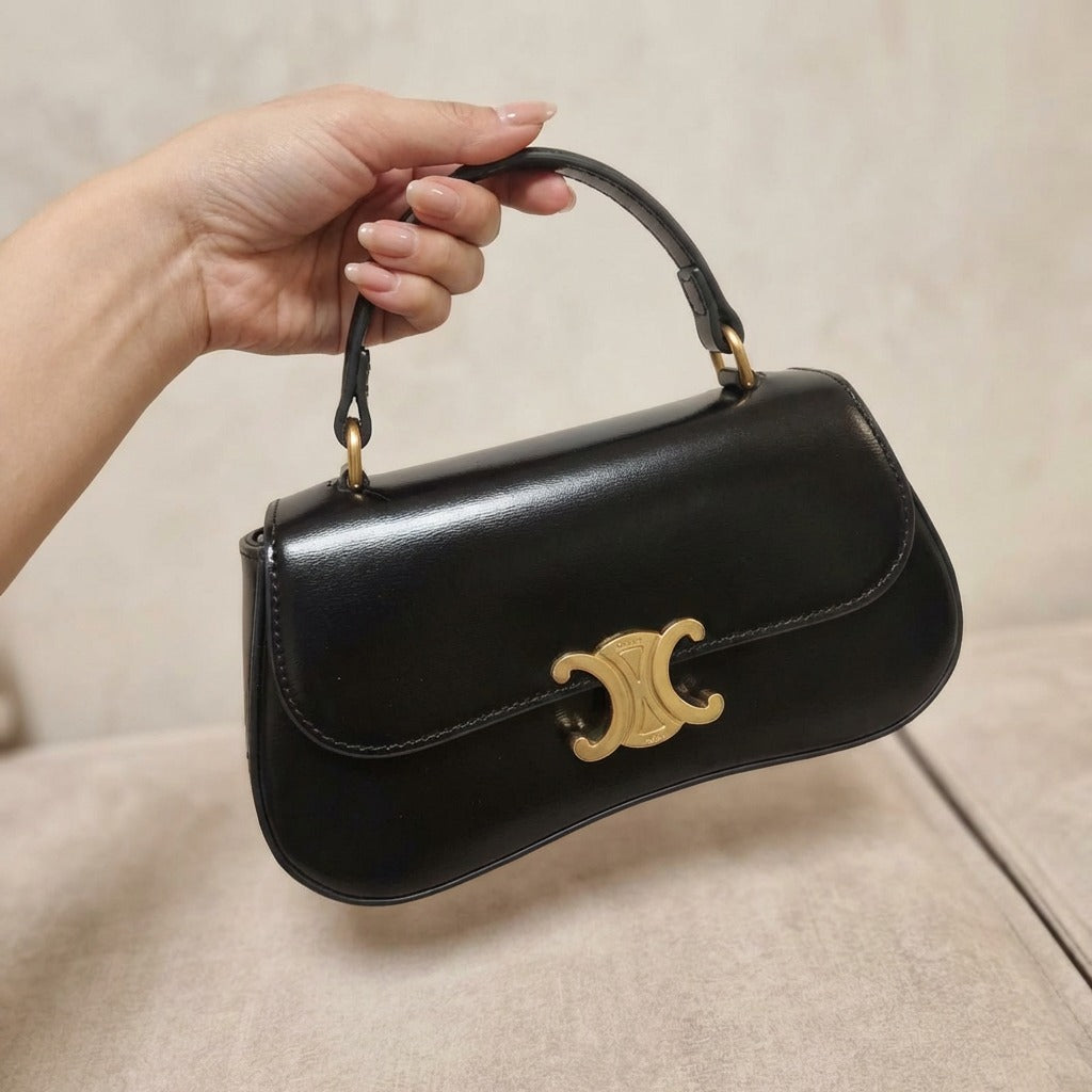 Капакът се затваря сигурно и разкрива добре организирано вътрешно пространство, подходящо за най-необходимите вещи – телефон, портмоне, ключове и козметични аксесоари. Златистите метални елементи допълват луксозното излъчване и хармонират перфектно с класическия черен цвят.