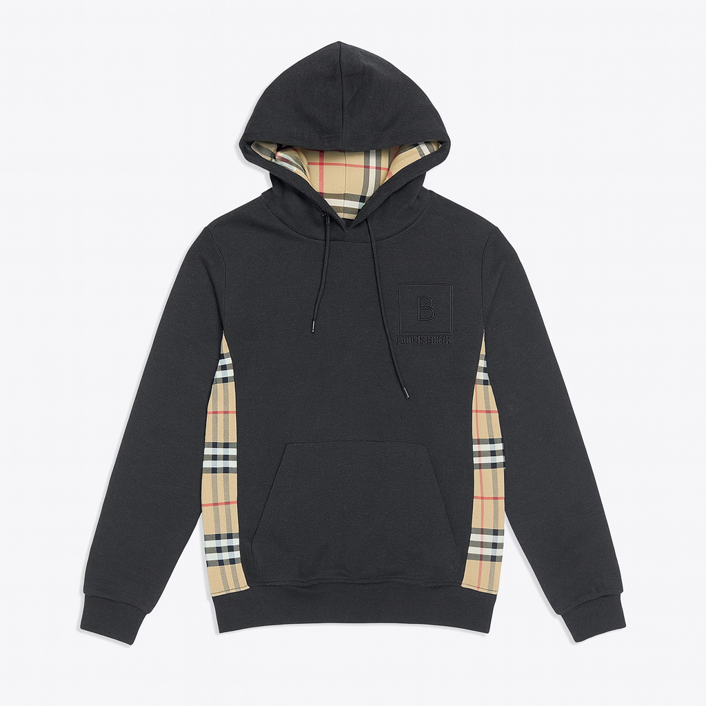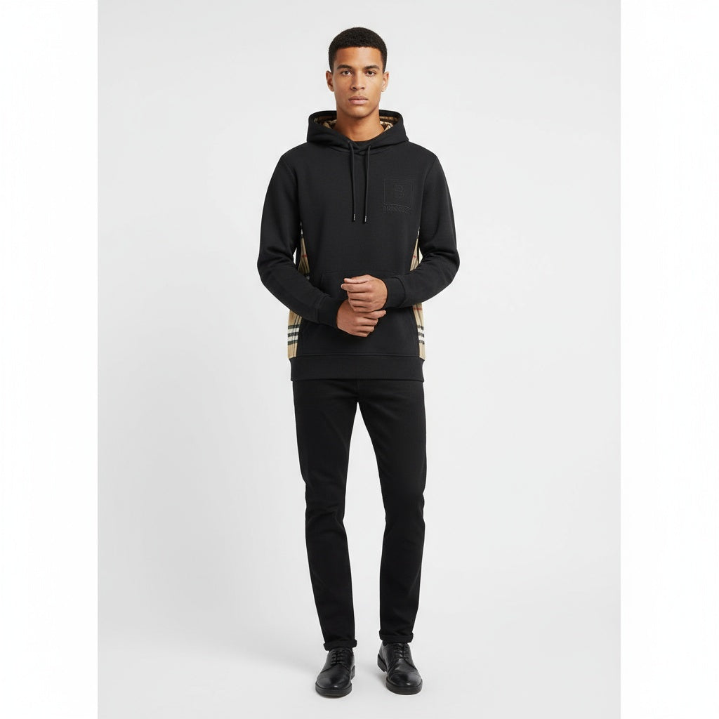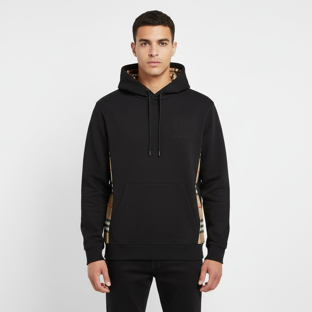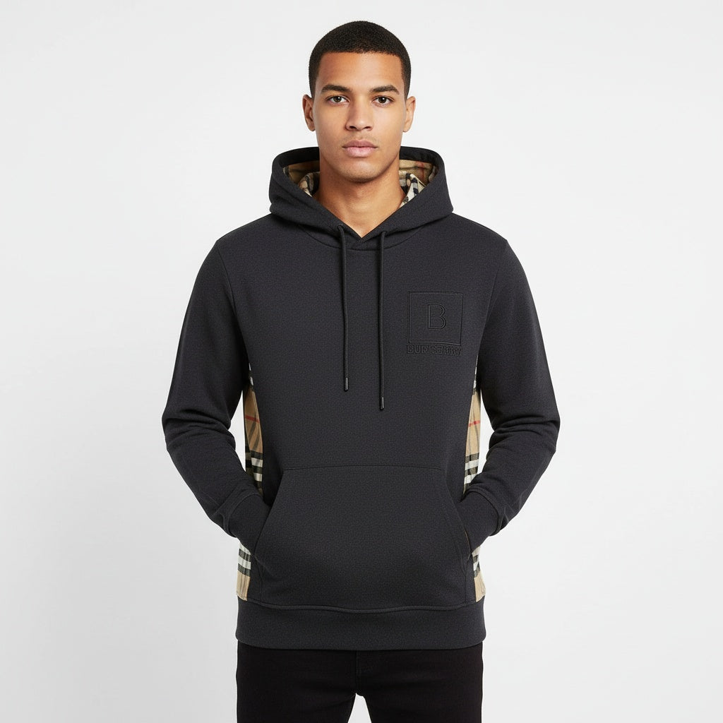 Добави класика и комфорт към ежедневния си стил с това черно худи, вдъхновено от вечния британски шик. Меката памучна материя осигурява удобство през целия ден, а характерните панели в бежово каре отстрани и във вътрешността на качулката придават изтънчен контраст и дизайнерски почерк.