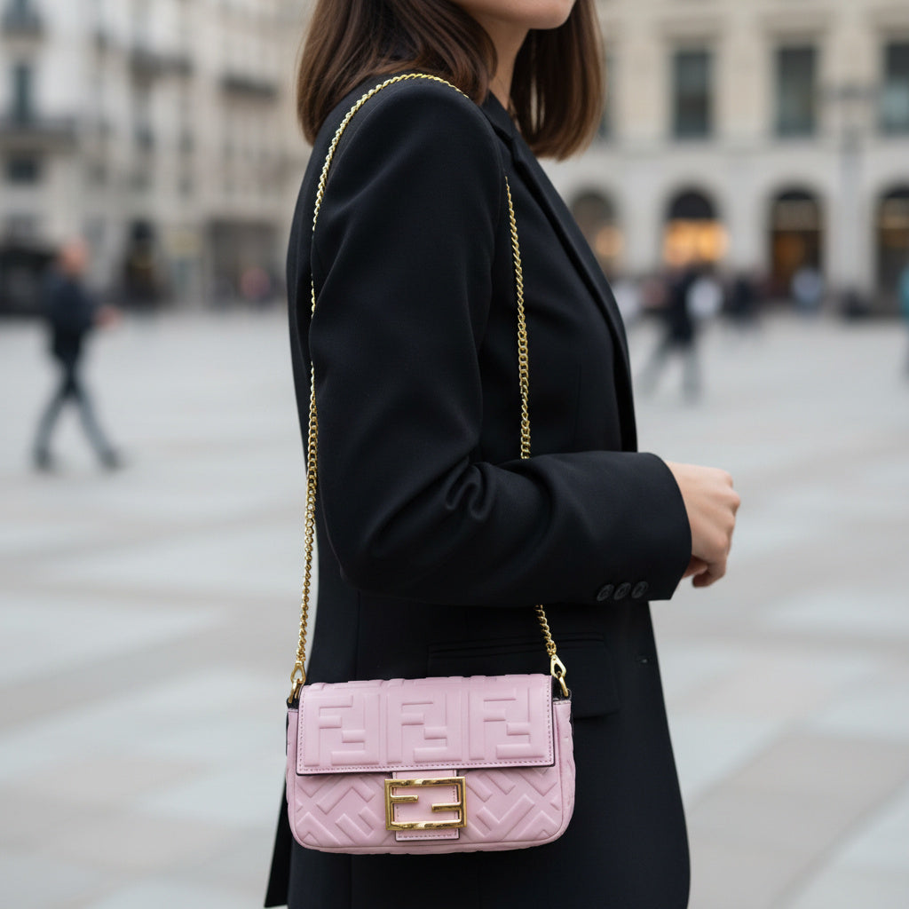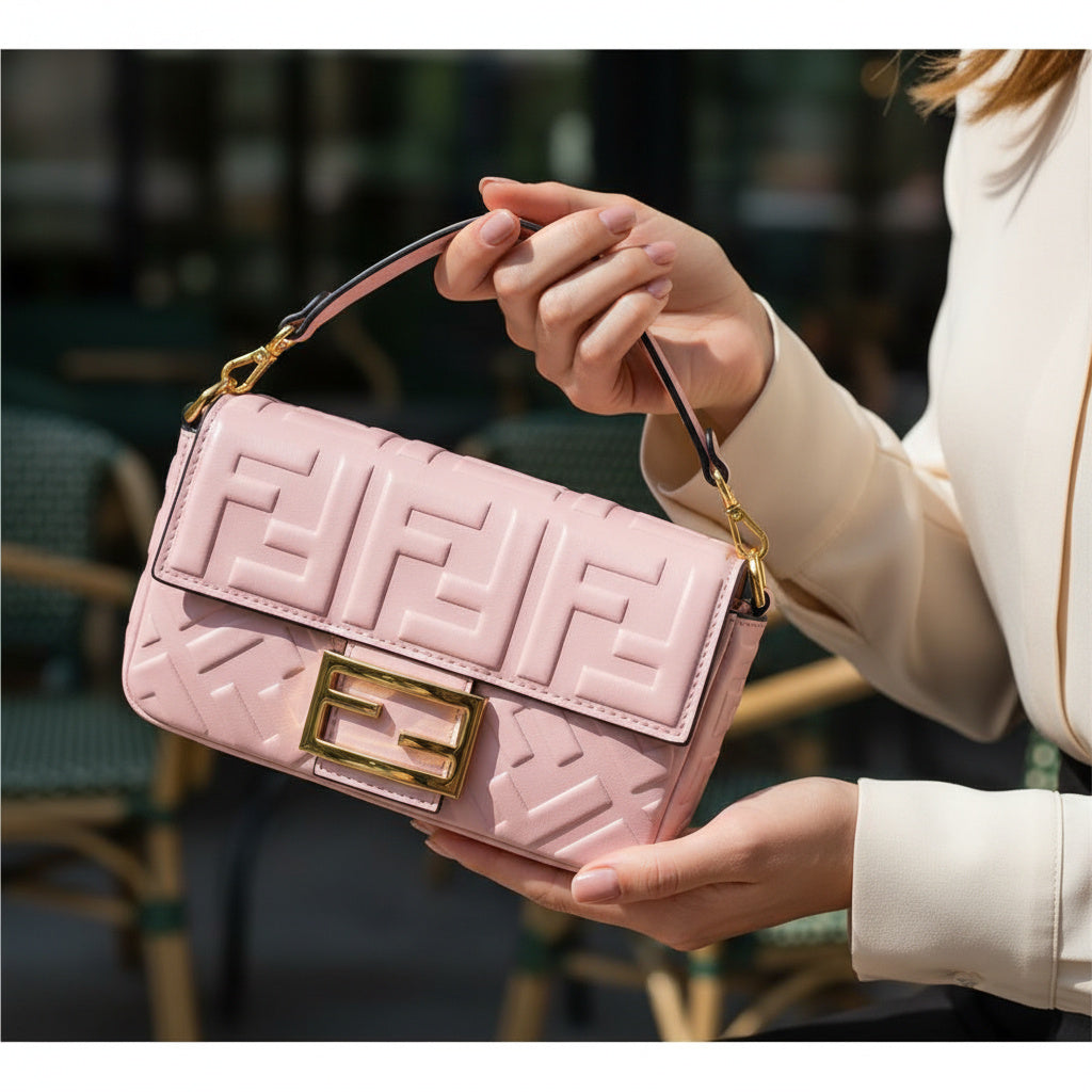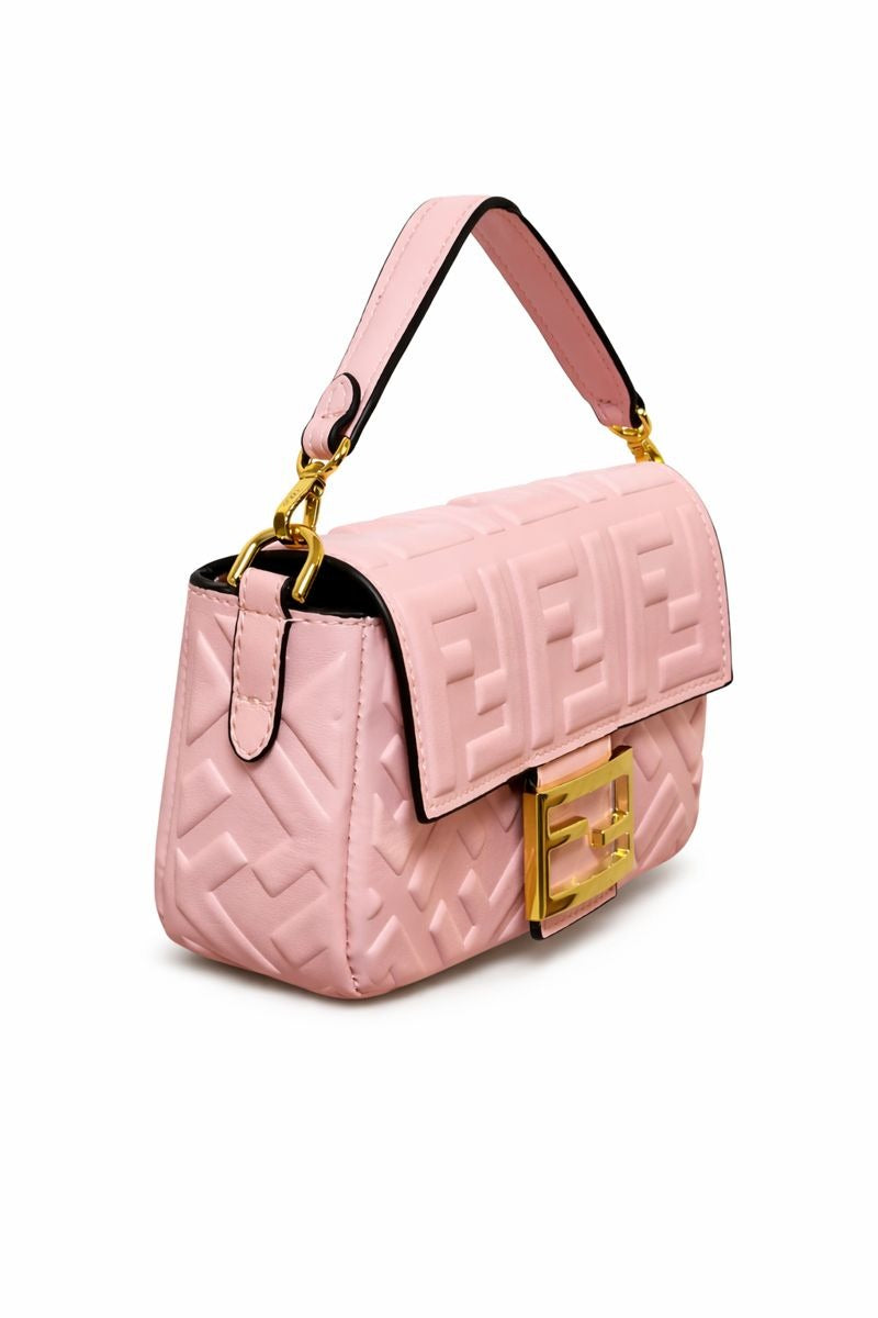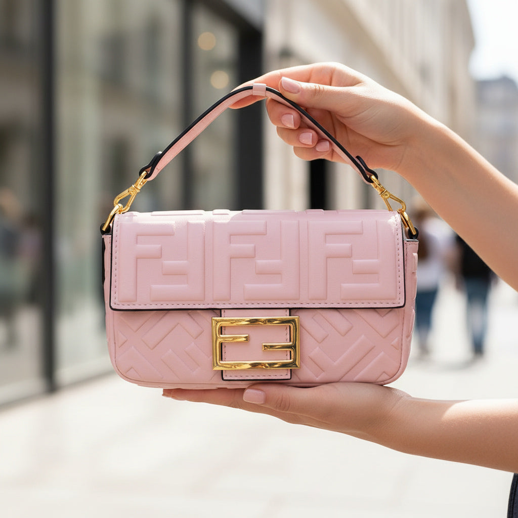 Елегантната дамска чанта F впечатлява с изискан дизайн и модерна визия, съчетаваща женственост и лукс. Моделът е изпълнен в нежен розов цвят с релефна текстура и стилен метален акцент отпред, който придава отличителен и завършен облик.
