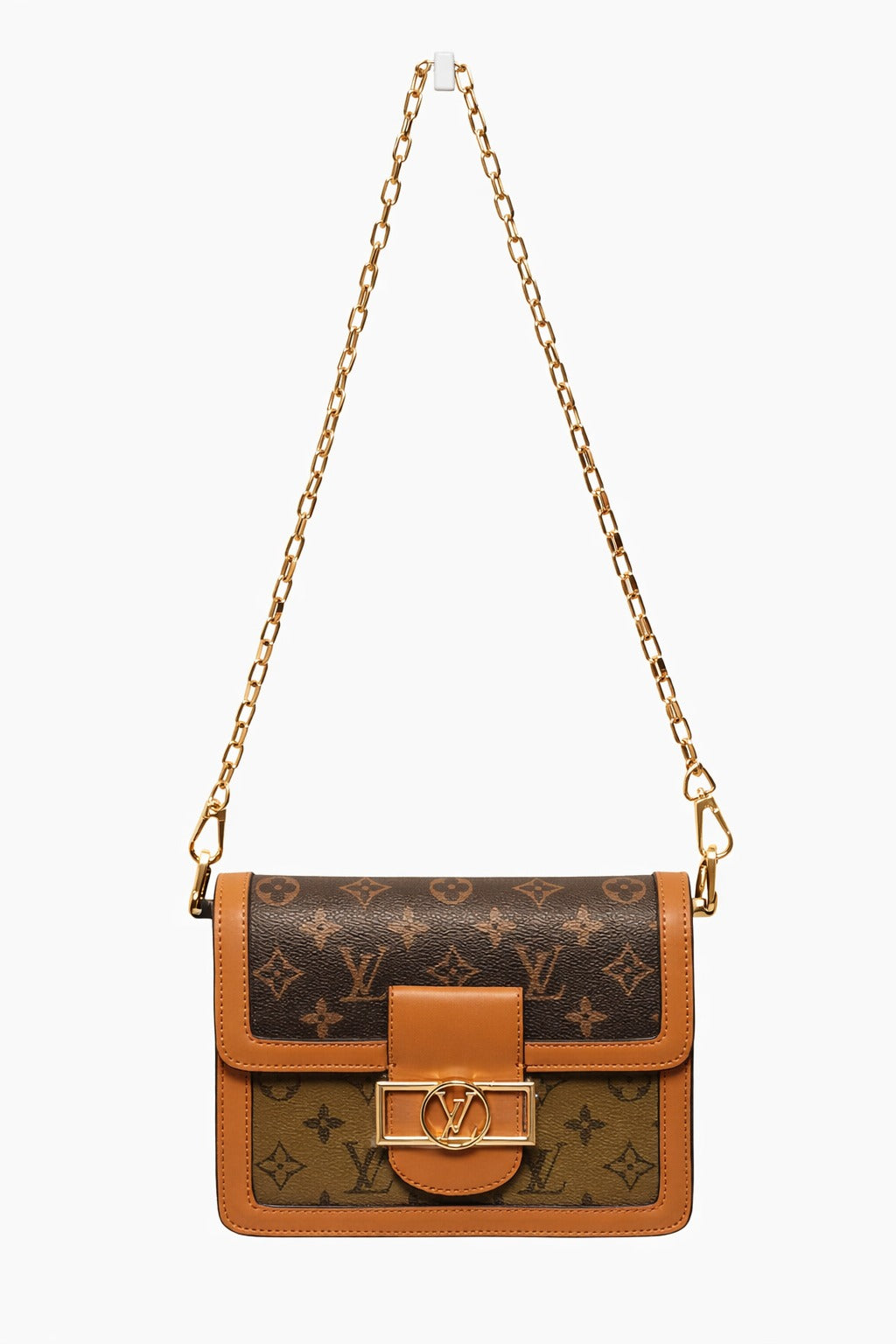 Елегантна дамска чанта Louis Vuitton, изработена от емблематичното Monogram платно и допълнена с естествени кожени детайли в топъл карамелен нюанс. Компактният, но функционален дизайн я прави идеален избор както за ежедневието, така и за по-специални поводи.