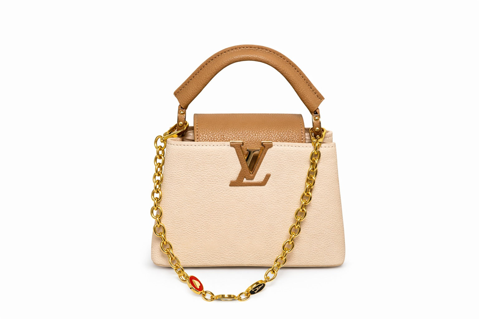 Елегантна и изискана, дамската чанта Louis Vuitton Mini Capucines е въплъщение на съвременния лукс в компактен размер. Изработена от висококачествена релефна кожа в нежен кремав нюанс, тя впечатлява със своята изчистена линия, твърда структура и емблематичното метално LV лого в златист завършек.