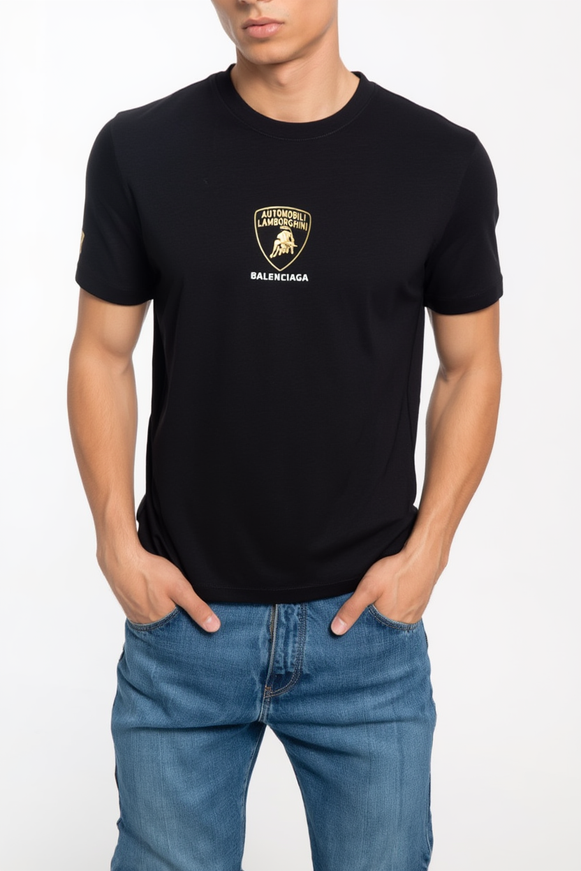 Мъжка тениска B в класически черен цвят, съчетаваща изчистен дизайн и премиум излъчване. Моделът е с малко, елегантно лого в златист тон, разположено централно на гърдите, което придава луксозен и модерен акцент, без да натоварва визията.