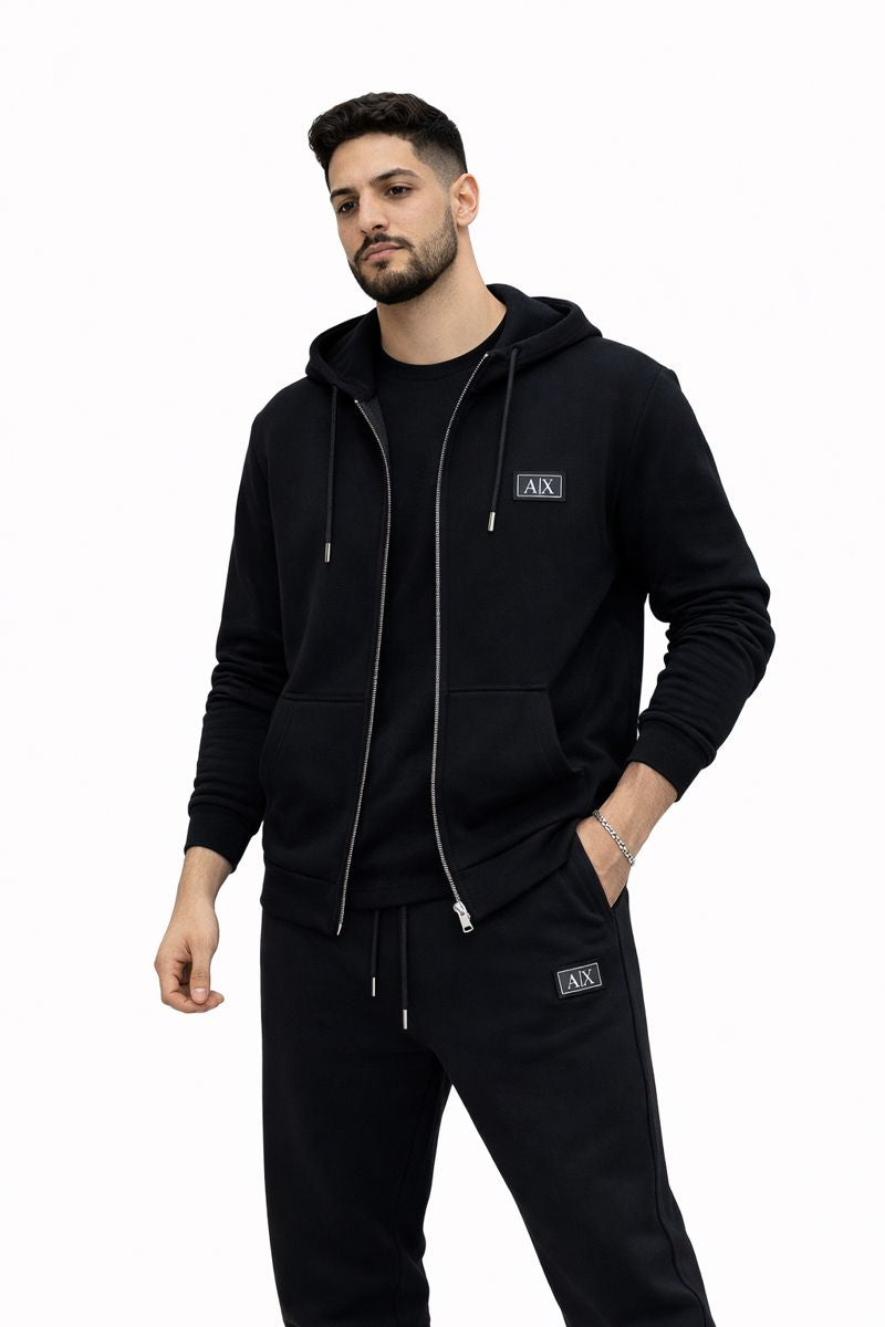 Горната част е със цип по цялата дължина и качулка, осигуряваща комфорт и практичност в ежедневието. Изчистената линия и дискретните детайли допринасят за усещане за премиум минимализъм и универсалност. Долнището е с отлично прилягане и свобода на движението, което го прави подходящо както за активен ден, така и за спокойна градска визия.