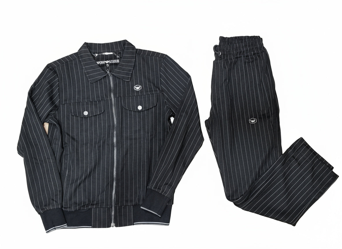 Елегантен и модерен комплект от Armani, създаден за мъже, които ценят изтънчения стил и комфорта. Горната част е с цип и практични джобове с капаци, а панталонът е с ластичен колан и връзки за перфектно регулиране. Фината вертикална райе шарка придава луксозно и подчертано изчистено излъчване. Подходящ както за ежедневно носене, така и за по-елегантни поводи.