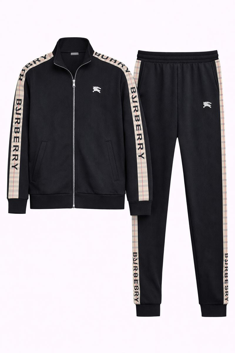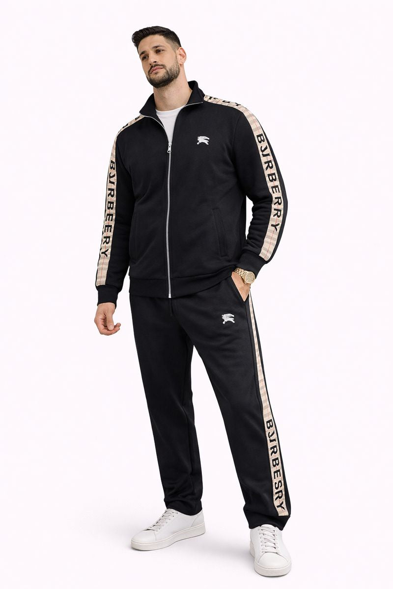 Мъжкият спортен комплект BUR съчетава емблематичен луксозен стил с модерна спортна визия, създавайки силно разпознаваем и елегантен силует. Класическият черен цвят е акцентиран с контрастни ленти по ръкавите и крачолите, които придават динамика и подчертават премиум излъчването на комплекта.