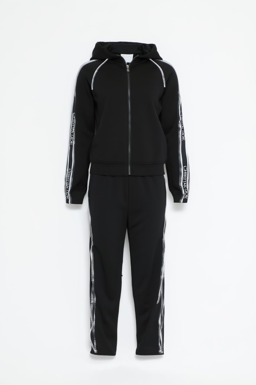 Мъжкият спортен комплект CD съчетава модерна спортна визия с отличителен луксозен характер. Изработен в класически черен цвят, моделът се откроява с контрастните странични ленти с надпис CD, които придават динамичен и разпознаваем стил.