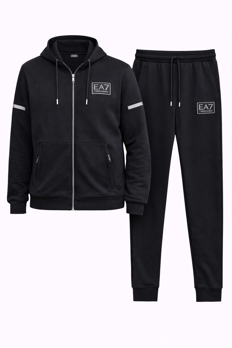 Мъжкият спортен комплект EA съчетава модерна спортна визия с изчистена елегантност и високо ниво на комфорт. Изпълнен в класически черен цвят, комплектът се отличава с минималистичен дизайн и характерни EA детайли, които придават стилен и динамичен облик.