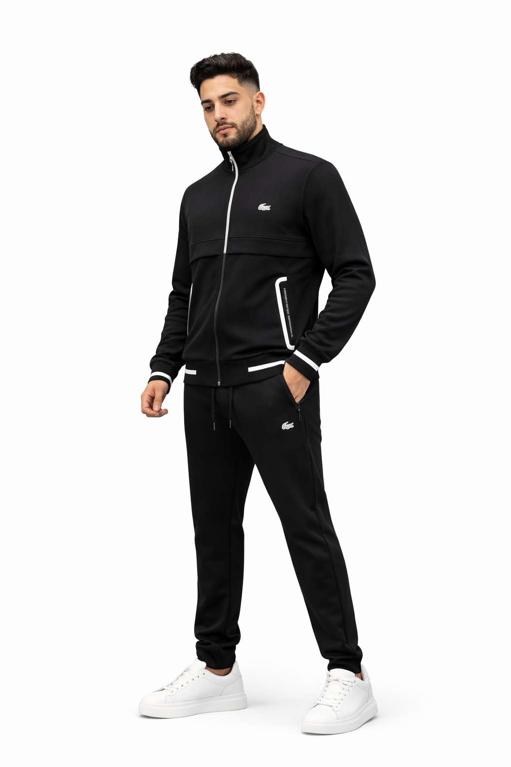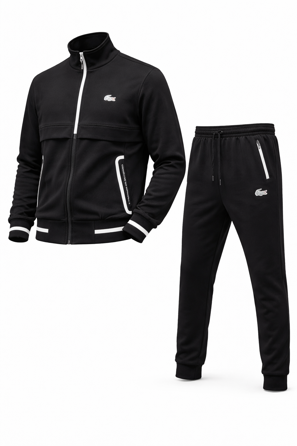Изчистеният мъжки комплект впечатлява с минималистичен дизайн, спортна елегантност и безупречно качество на изработка. Изпълнен в класически черен цвят, сетът е акцентиран с контрастни бели детайли и емблематичното лого с крокодила, което придава разпознаваем и модерен характер.