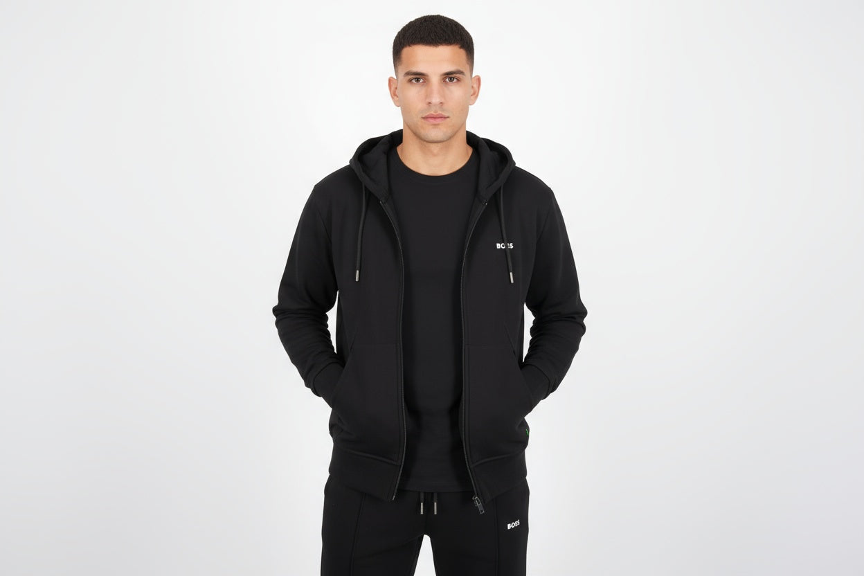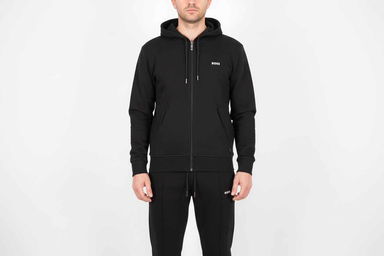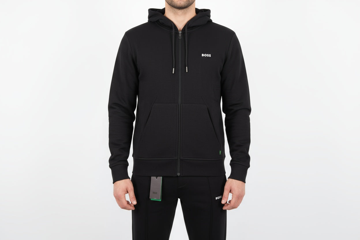 Изработен от мека памучна материя с еластичност, той осигурява свобода на движение и приятно усещане през целия ден. Горнището с цип и качулка добавя спортно излъчване, а долнището с ластична талия и връзки гарантира комфорт и практичност. Дискретното лого BOSS в бяло придава завършен и луксозен акцент.
