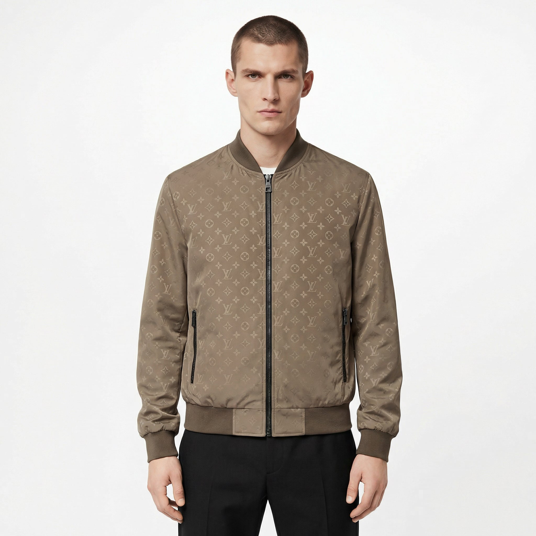 Елегантният бежов нюанс е допълнен от деликатния монограм Louis Vuitton, който придава на модела луксозен и разпознаваем характер. Класическият bomber силует, металният цип и ластичните маншети създават модерна линия, която подчертава мъжката фигура и придава изискано градско излъчване.