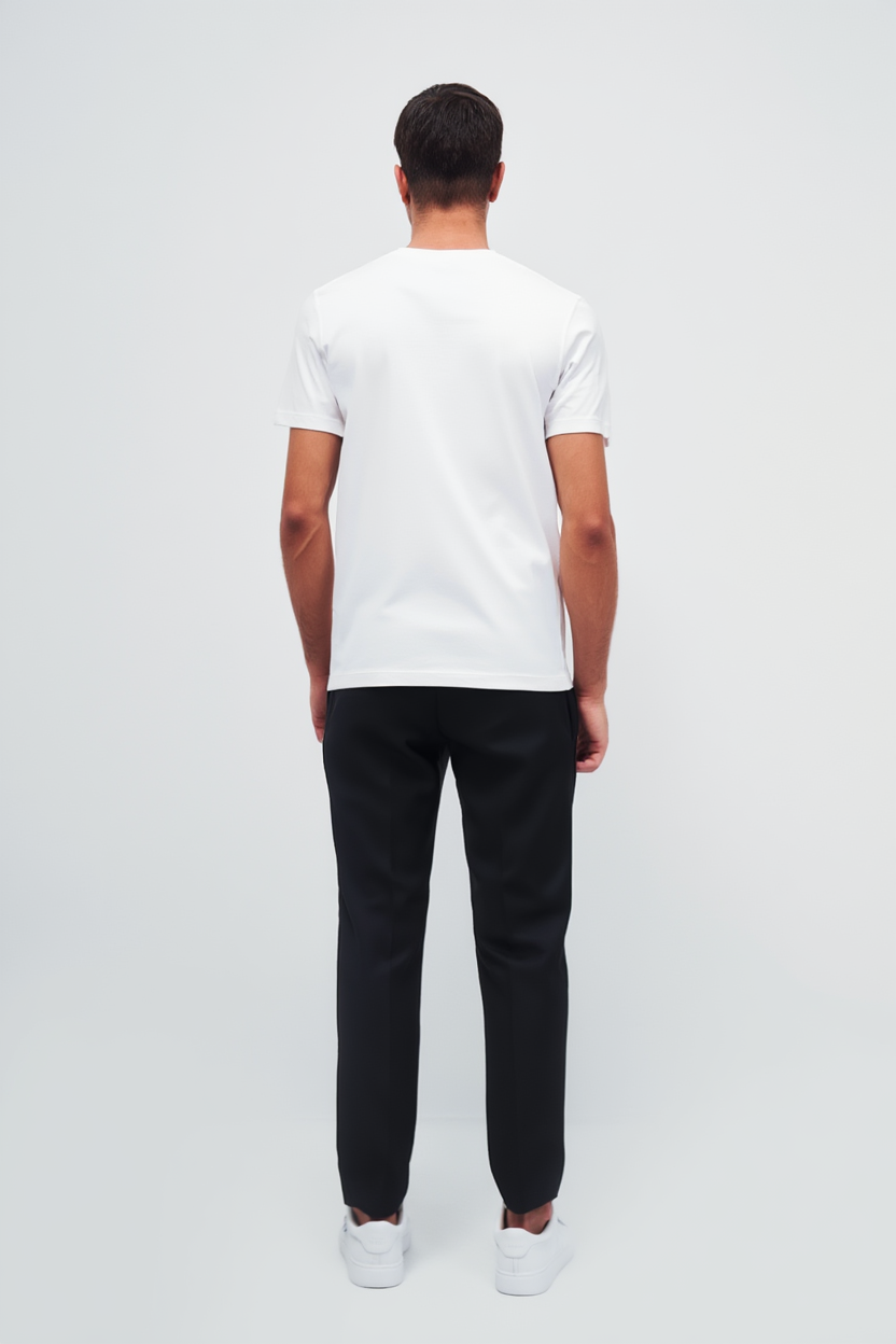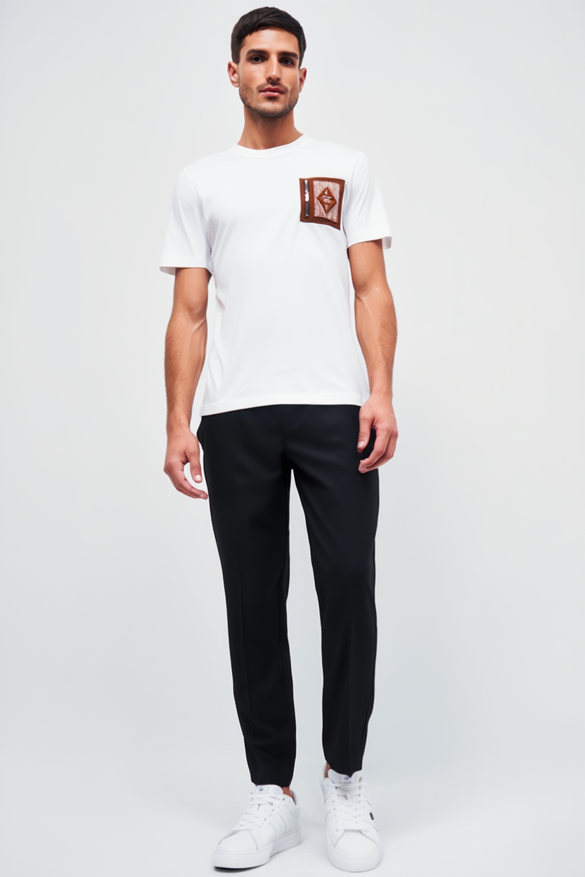 Моделът е в класически бял цвят с минималистичен дизайнерски елемент на гърдите, който придава елегантен и разпознаваем характер. Правата кройка и меката материя гарантират свобода на движение и перфектно прилягане.