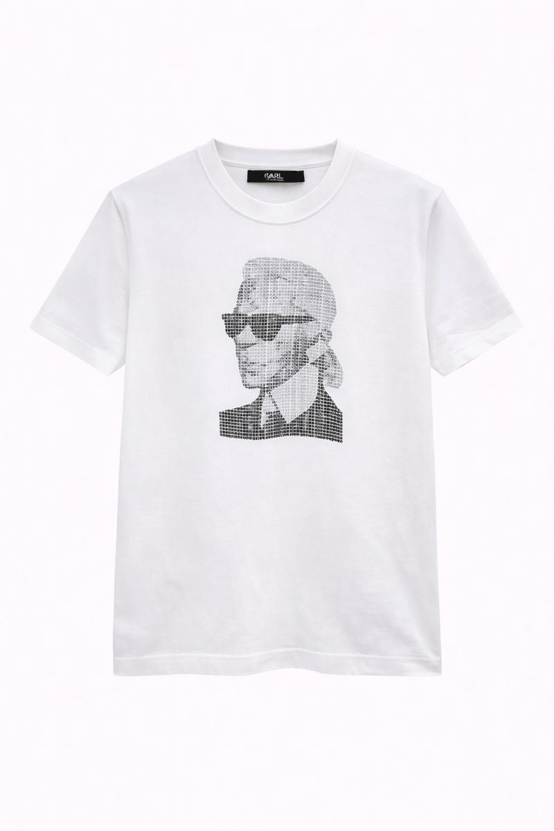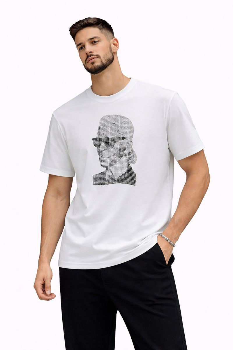 Елегантната мъжка тениска KL съчетава минимализъм и артистично излъчване в модерен градски стил. Изпълнена в класически бял цвят, тя е акцентирана с изразителен графичен принт, който придава характер, индивидуалност и стилна дълбочина на визията.