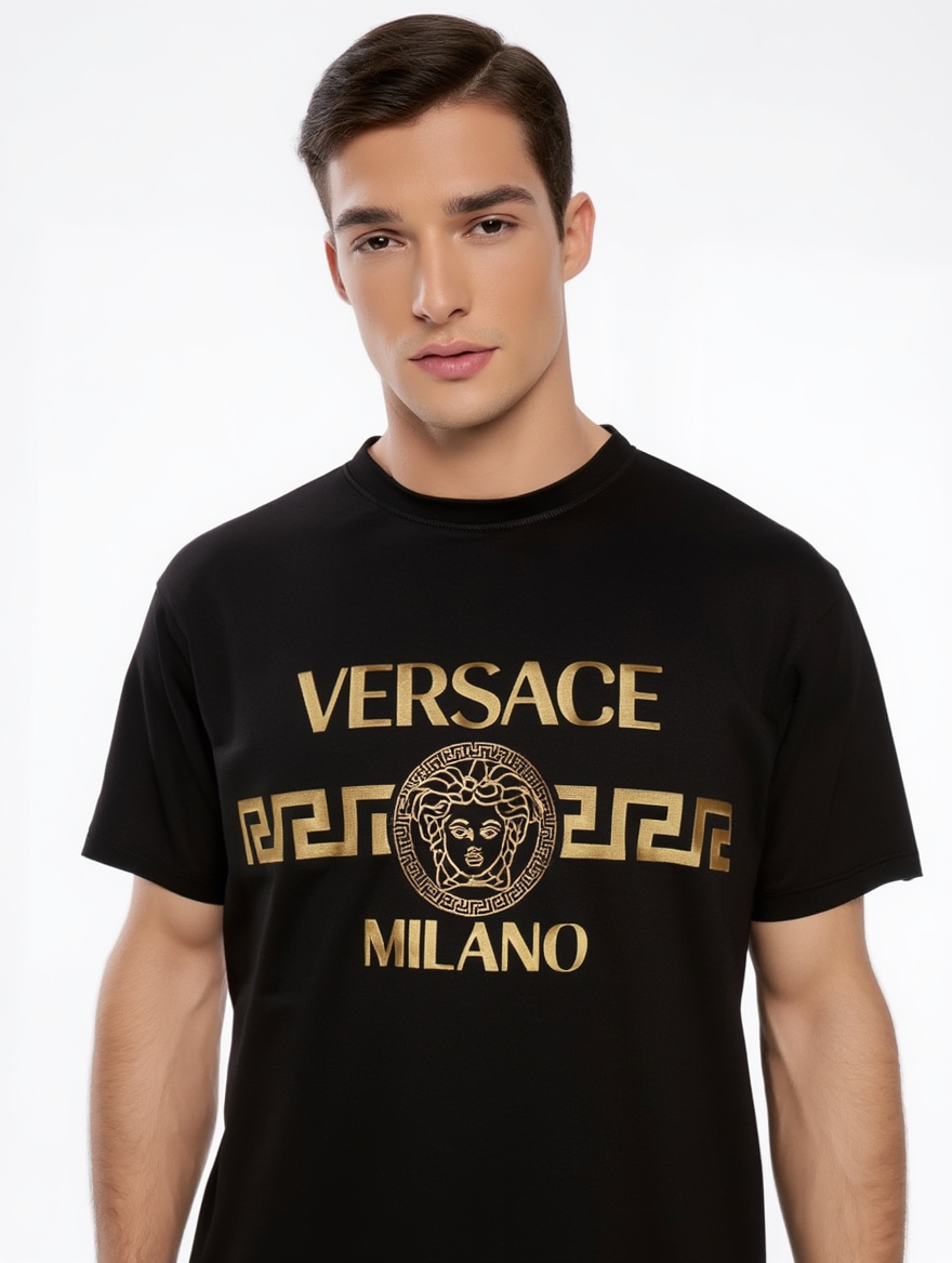 Елегантна мъжка тениска VER в класически черен цвят, съчетаваща луксозен стил и модерна визия. Моделът впечатлява с изразителен златист принт отпред, вдъхновен от емблематични италиански мотиви, който придава силно присъствие и разпознаваем характер. Изчистената кройка следва линията на тялото, като осигурява комфорт и стил през целия ден. Подходяща както за ежедневни визии, така и за по-елегантни комбинации, тази тениска е отличен избор за мъже, които търсят баланс между лукс и съвременна естетика.